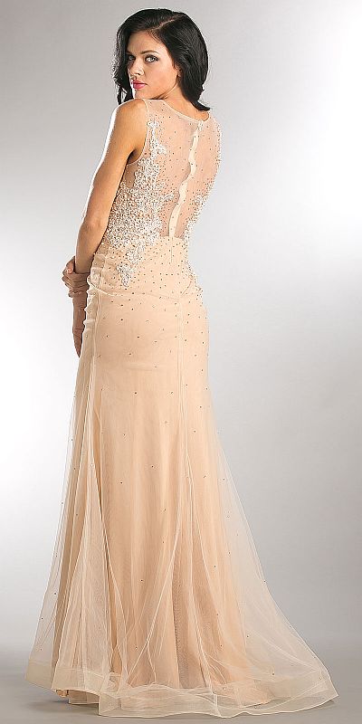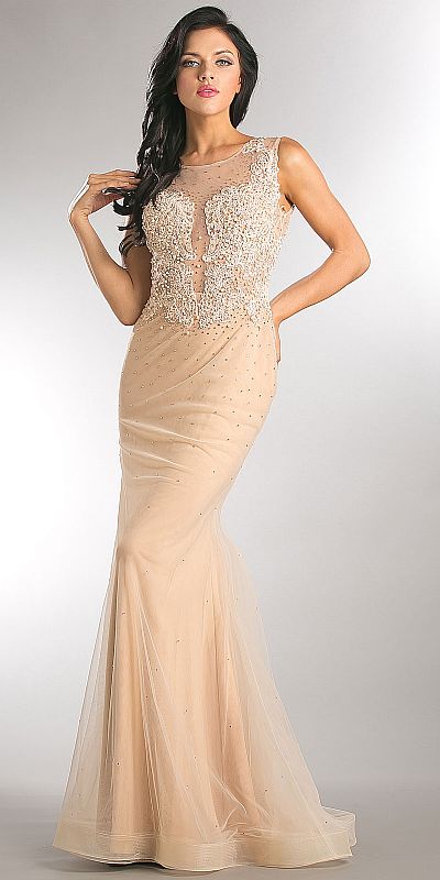 Embroidered Lace Top Mesh Tulle Long Prom Pageant Dress. Round neck sheer mesh top with embroidered lace accent & rhinestones adorning the dress all over. Flared & layered mesh tulle skirt gives the dress a romantic feel. Bra cups & closed sheer back with zipper closure. Imported.