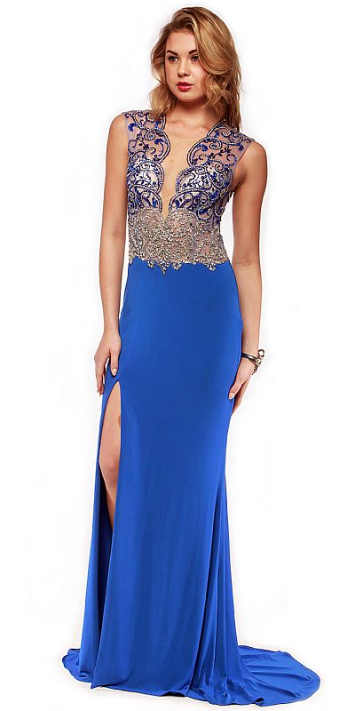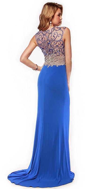 Mesh Rhinestones Bodice Long Prom Pageant Dress. Round neck mesh bodice has exquisite stems with leaves pattern in beads & rhinestones in gold as well as silver. Sheer mesh along the neckline, deep v-neck, waist & at back also. Flared skirt has side slit in the front with also train at the back. Sheer mesh back has same pattern with side zipper closure & padded bust. Imported.