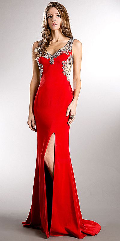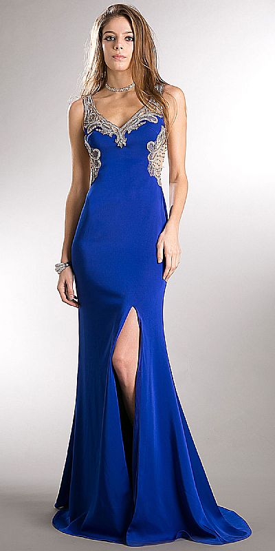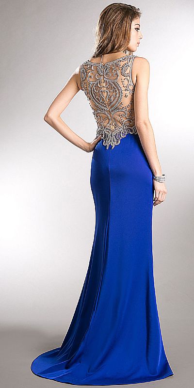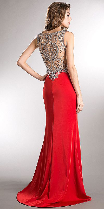 Bejeweled Bust & Back Floor Length Prom Pageant Dress. V-Neck sleeveless dress has sheer mesh neckline, waist & back embellished with chunky rhinestones & beads. Elegant pattern at the sheer mesh back with zipper closure. Front side slit with little train at the back too. Imported.