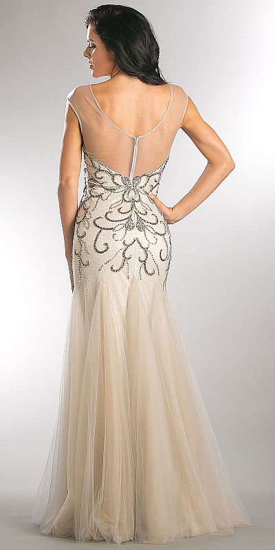 Beaded Mesh Tulle Mermaid Style Long Prom Pageant Dress. Sweetheart neck on bust with sheer round neck mesh at the top. Fitted bodice with an alluring beads & rhinestones pattern extended to the back too. Flared mesh tulle skirt adds elegance & style to this formal dress. Sheer v-shape back with zipper closure. Imported.