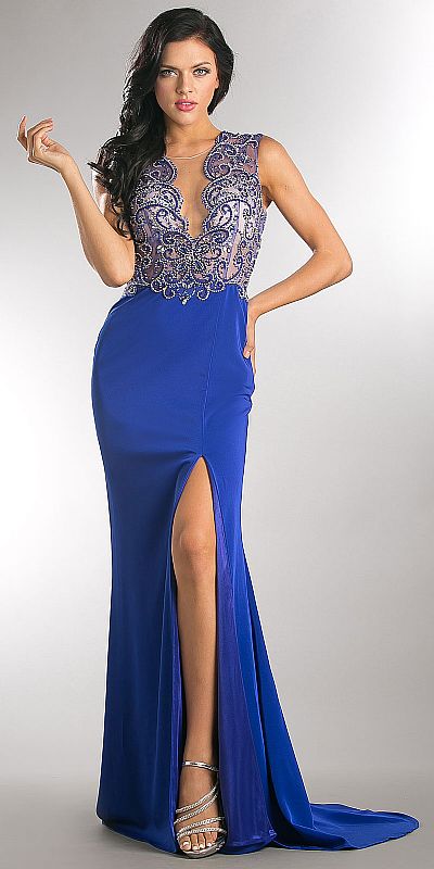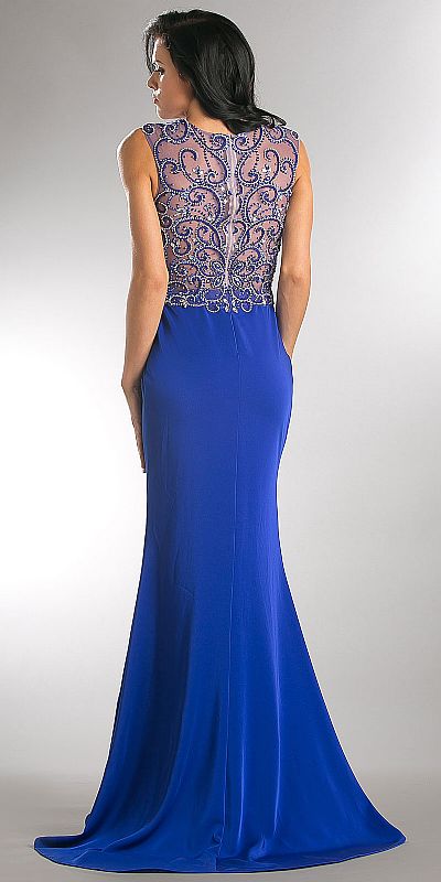 Elegant Beaded Sheer Bodice Long Prom Pageant Dress. Round neck sheer mesh bodice has exquisite stems like pattern in beads & rhinestones. Bra cups with sheer mesh in the middle. Fit & flare skirt has side slit in the front with train at the back. Beaded sheer mesh closed back with zipper closure. Imported.