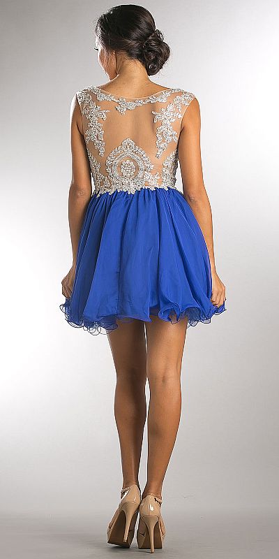Embellished Lace Bodice Short Babydoll Homecoming Dress. Sheer mesh above the sweetheart neckline on the bodice. Cap sleeves on this closed sheer mesh back dress with side zipper closure. Layered chiffon skirt with trendy ruffled hemline. Imported.