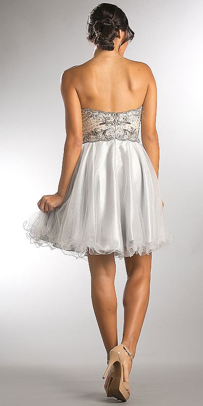 Strapless Embellished Top Shimmery Tulle Short Homecoming Dress. Scallops design at the strapless neck with endearing beaded & rhinestones pattern on bodice. Layered shimmery tulle skirt with ruffled hem gives flirty look to the dress. Back zipper closure. Imported.