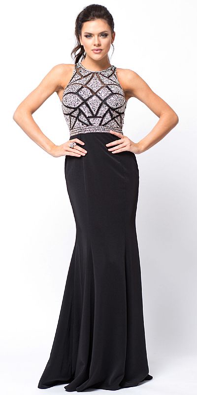 Sleeveless Beaded Top High Neck Long Formal Prom Dress. High round neck beaded bodice. Back zipper closure. Imported.