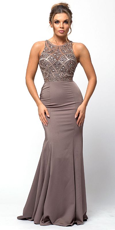 Sleeveless Beaded Top High Neck Long Prom Dress back in Mocha