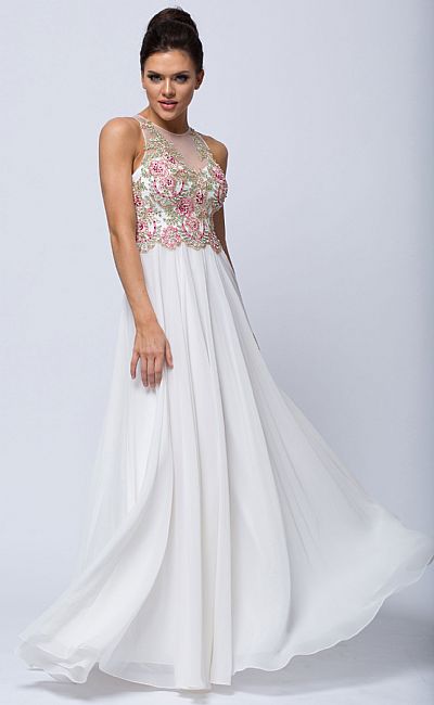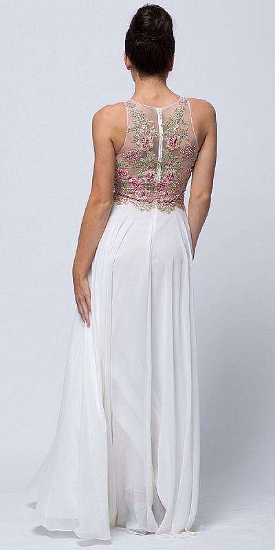 Sleeveless Floral Accent Beaded Top Long Prom Dress back in Ivory/Pink
