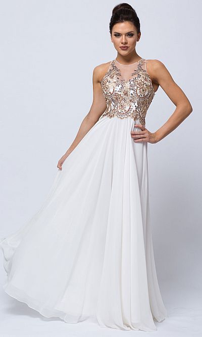 Beaded prom dress with free flowing skirt and beaded top with mesh round high neckline. Back zipper closure. Closed back. Imported.