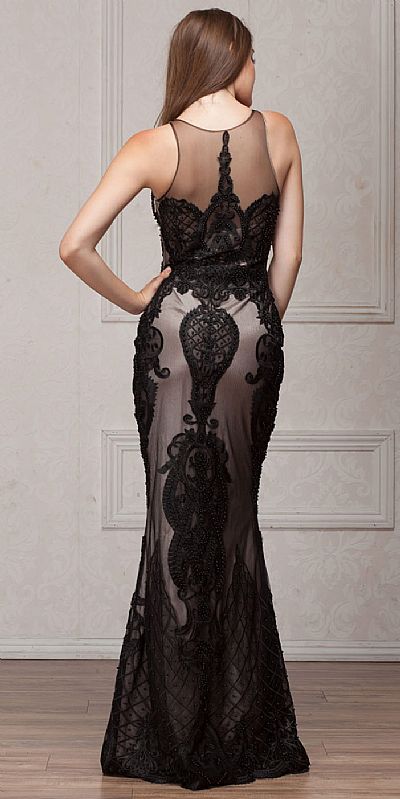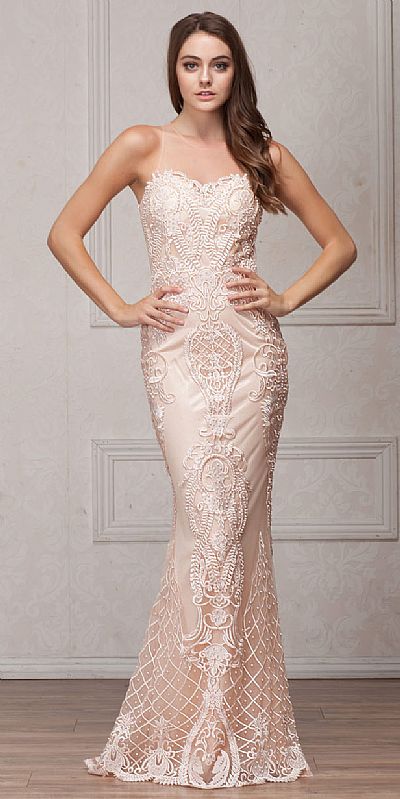 Beads & Lace Accent Long Fitted Formal Prom Pageant Dress. Fitted mesh dress has an exquisite pattern in beads & lace applique all over. Sheer mesh around the neckline & back with sweetheart bust. Side zipper closure. Imported.