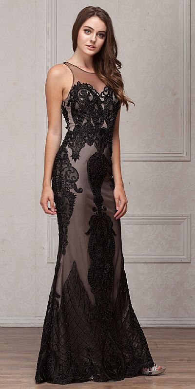 | BEADS & LACE ACCENT LONG FITTED FORMAL PROM PAGEANT DRESS (item #a764)
