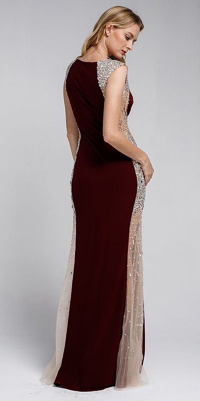 Silhouette styled evening prom gown with rhinestone accents. Features back zipper closure and a slimming silhouette.