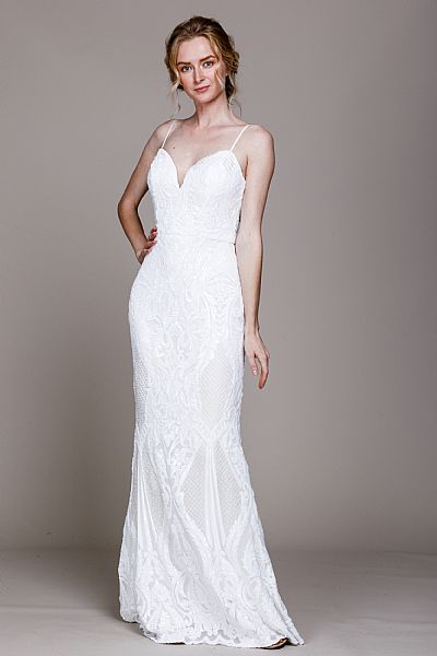 Sequin prom gown with spaghetti straps. This fitted gown accentuates the silhouette. Back zipper closure.