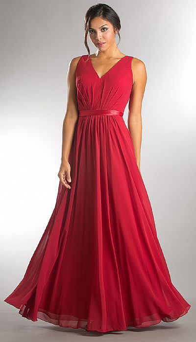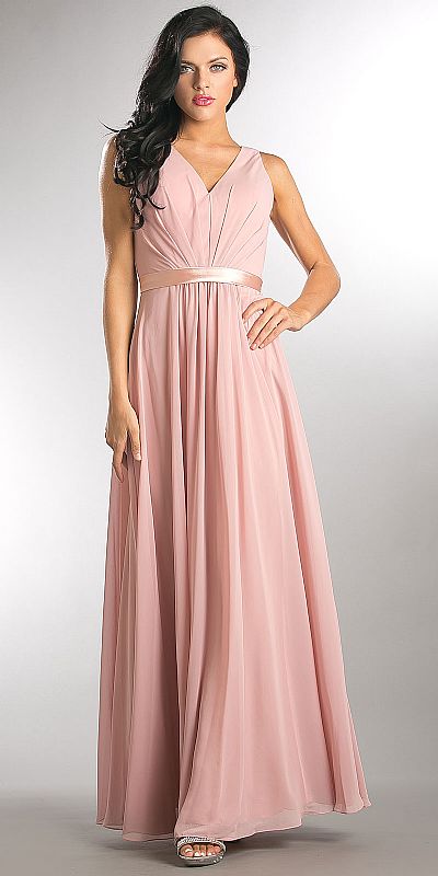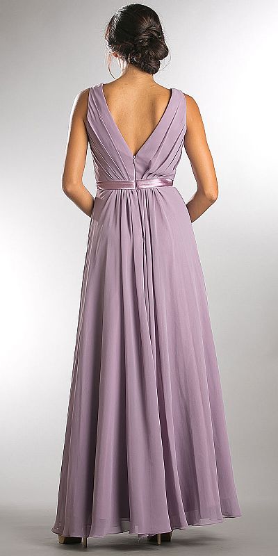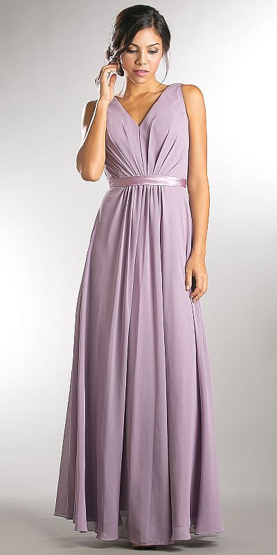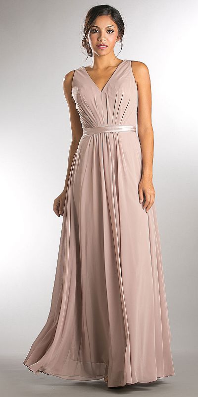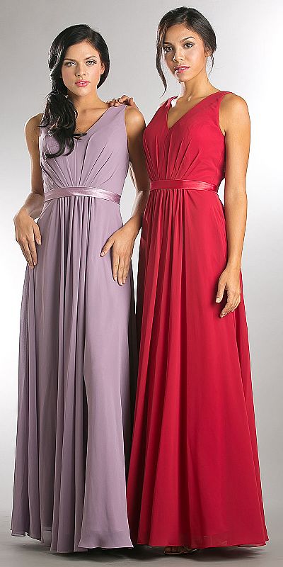 V-neck Sleeveless Ruched Bodice Long Bridesmaid Dress. Dress is gathered at the bust & skirt towards the middle with satin belt accent on it. V-neck & back with zipper closure. A-shape skirt gives a dreamy look to this dress & makes it a perfect choice as a bridesmaid dress. Imported.