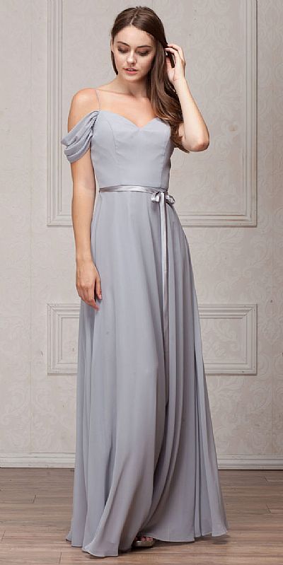 Spaghetti Straps Cold-shoulder Ribbon Waist Long Bridesmaid Dress. V-neck with gathered hanging sleeve (which can cover the shoulder too) & ribbon accent at the waist tied on the side. Round back with zipper closure. Imported.