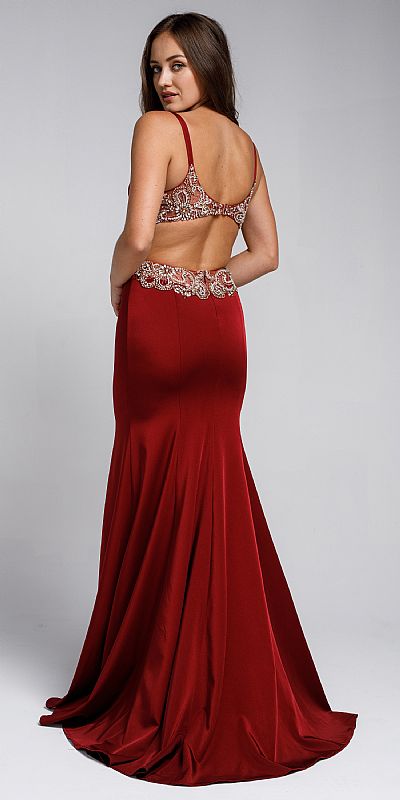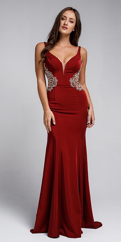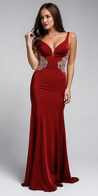 Sweetheart neckline fitted sateen prom gown. Features embroidered waistline, back zippered closure.