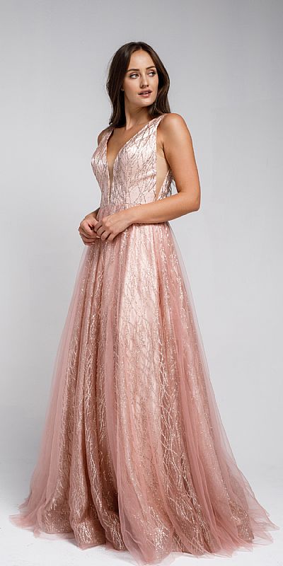 V Neck vines pattern tulle prom gown. Features exquisite and elegant pattern. Features back zipper closure.