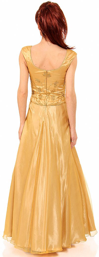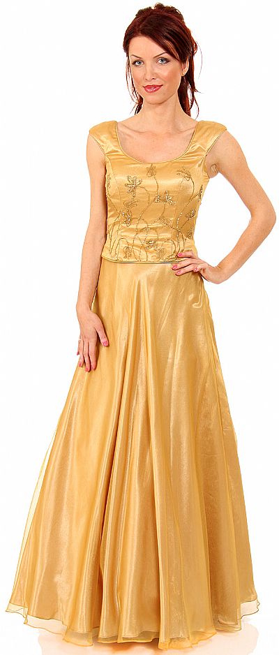 U-Neck Sleeveless Beaded Top Long Formal Prom Dress. Floral beaded pattern on the top with attached a-shape puffy skirt. U-shape back with back zipper closure. Shiny organza fabric over polyester lining. Imported.