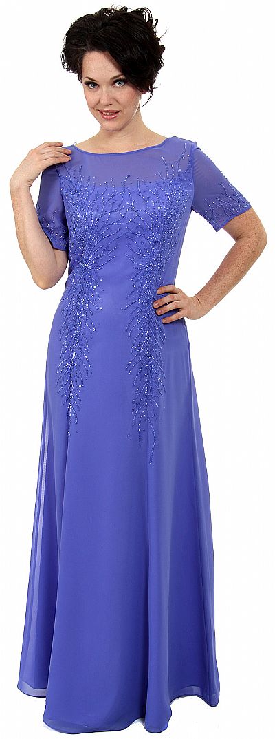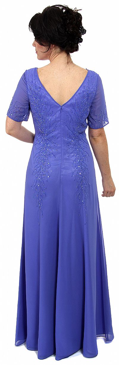 Short sleeved formal long gown has sheer sleeves and sheer neckline. Dress has a vertical beaded design along the front and back and beading along the sleeves. Bust part is padded. Dress has a V-back with back zipper closure. Made of 100% polyester. Imported.