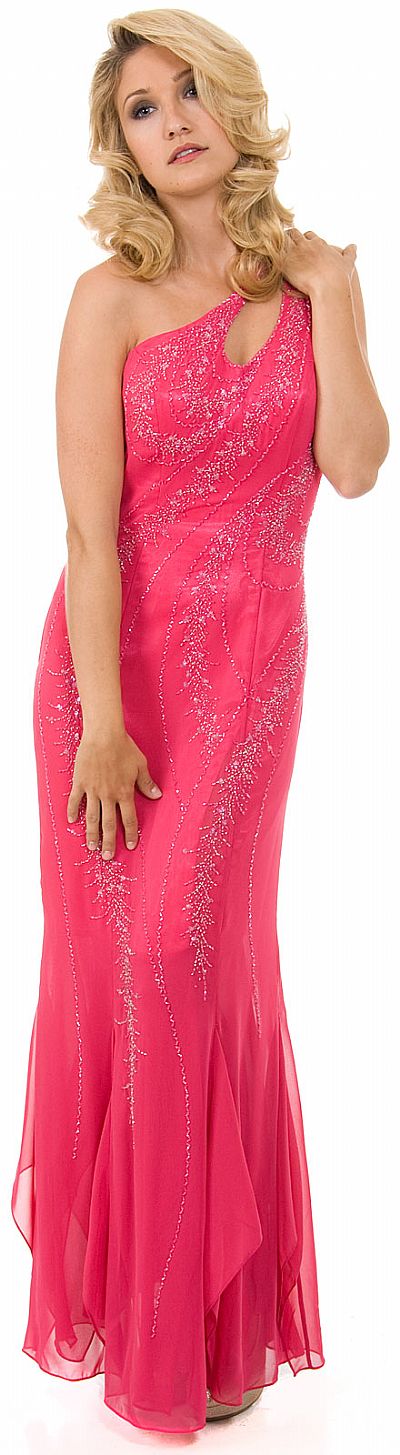 One Shoulder Beaded Formal Prom Dress with Mermaid Style Bottom. Double straps at mid-low back with zipper closure also. Keyhole above bust with handkerchief like hem of the dress. Elegant beaded pattern all over the dress. Imported.