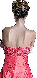 4 layered strapless prom dress. The miniature flowers that accentuate the top gives a very captivating and stylish look. This is one of a kind in our prom collection. Made of Shimmer and has Acetate lining.
