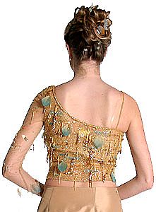 This 3 piece dress consists of a 4 layered skirt, an English Net top over a tube insert top. Skirt is made of wrap around silk taffeta material over English Net and Polyester Lining. Semi see-thru top with see-thru sleeve on one side. Top fully beaded with petals and beads over English Net. Petal like accent and beads on bottom of skirt.