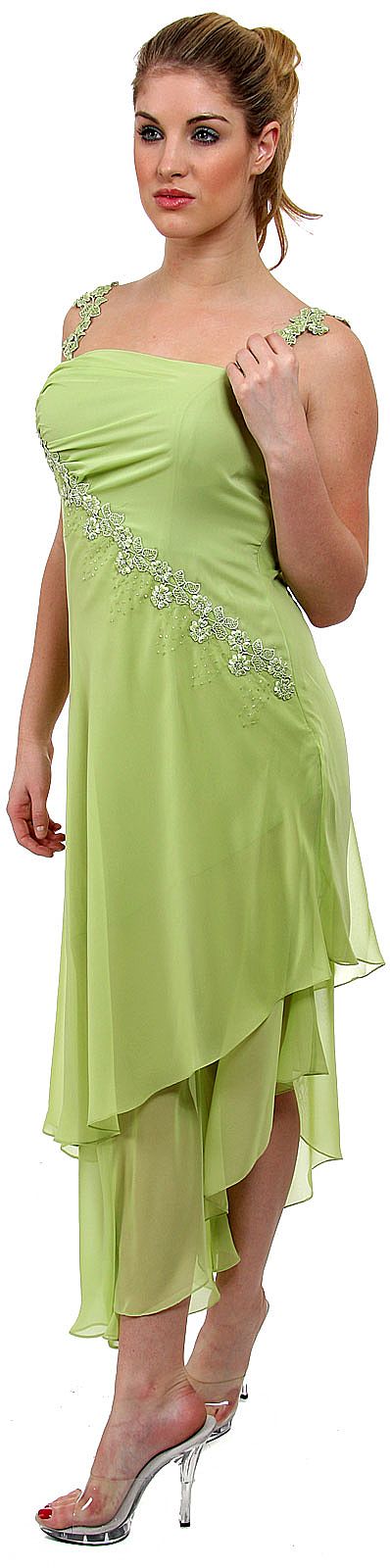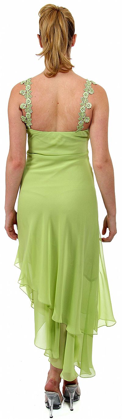 The miniature floral patch straps give a beautiful touch to this one of kind dress. The asymmetric layers of the skirt give a graceful overall touch to the dress.