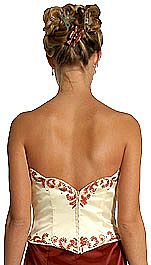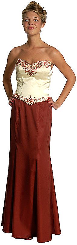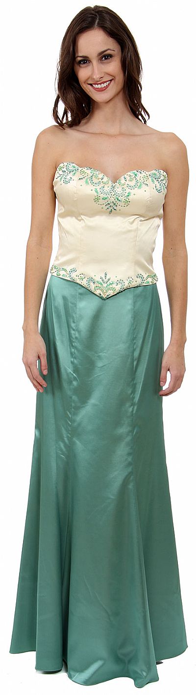 Two tone long dress with elegant beadwork. Skirt of solid color brings an overall figure flattering impression. Strapless with a sweetheart neckline. Back zipper closure. Imported.