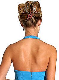A brooch and ruffle combination on a halter neck creation. Beads adorn the halter neck line and the rhinestone brooch accentuates the mid bodice.
