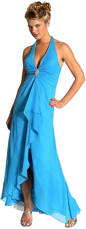 | HALTER NECK FORMAL PROM DRESS WITH RUFFLES AND BROOCH (item #c27333)