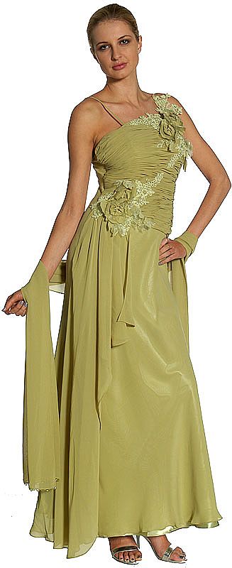 Shirred Bust Floral Applique Formal Prom Dress. Shirred bodice with floral applique around shoulders & at the waist. Lace also decorates the bodice with wrap around style skirt. Thin spaghetti straps run from the front to the back with back zipper closure. Matching scarf included. Imported.