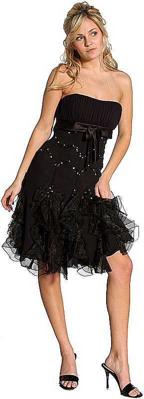 Ruffles cascading on the skirt of this dress gives it a very eloquent look. Silver bead-work and a satin bow accentuates this short prom dress. Made of Organza and Polyester Chiffon. Length is about 32 inches.