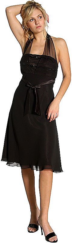 Halter Neck Empire Cut Silk Chiffon Formal Party Dress. Beaded bust with sheer fabric over neckline. Tie in the front satin bow accent with back zipper closure. Hook closure at the back of neck. Imported.