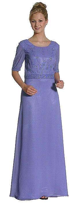Half-sleeved formal gown has a beaded top with floral details, a round neckline, and a V-back with back zipper closure. A shape style dress. Made of 100% polyester. Imported.
