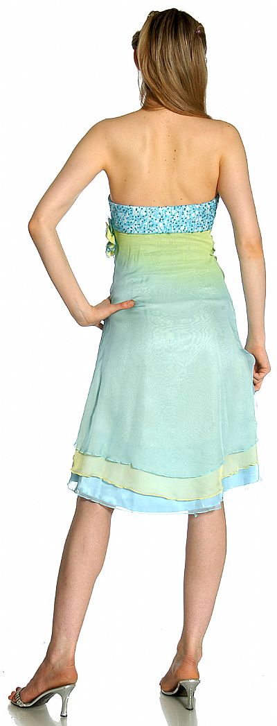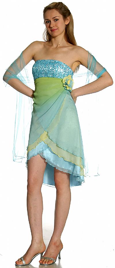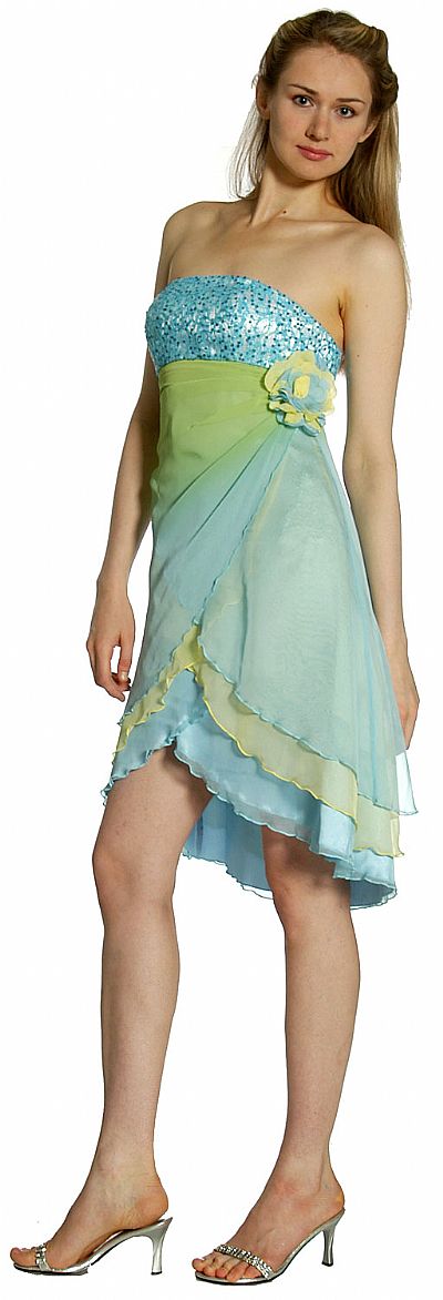 Short wrap-around prom dress with sequin bodice. Has a non-removable ornamental flower and a multi-layered wrap around skirt.
