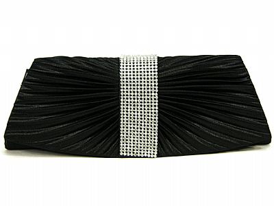 Satin cluch with centralized rhinestone wide strap; in black. Measures: 11.5 x 4 x 2 inches