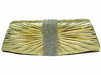 Satin cluch with centralized rhinestone wide strap; in gold. Measures: 11.5 x 4 x 2 inches