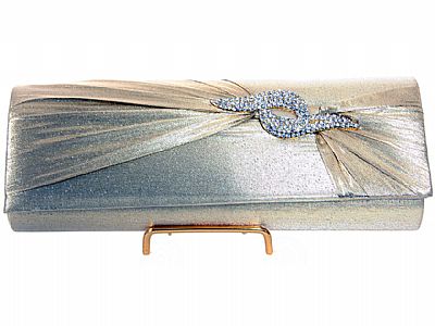 Satin clutch with sparkling rhinestones ornament; in gold. Detachable metal chain included. Measures: 10.75 x 4 x 2.5 inches