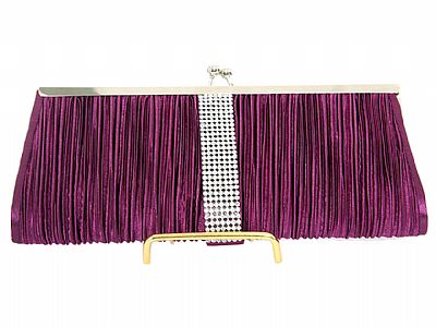 Ruched evenig bag with kiss lock and accentuating rhinestones studded band at center. Shoulder chain included. Measures: 10 x 4.5 x 1 inches