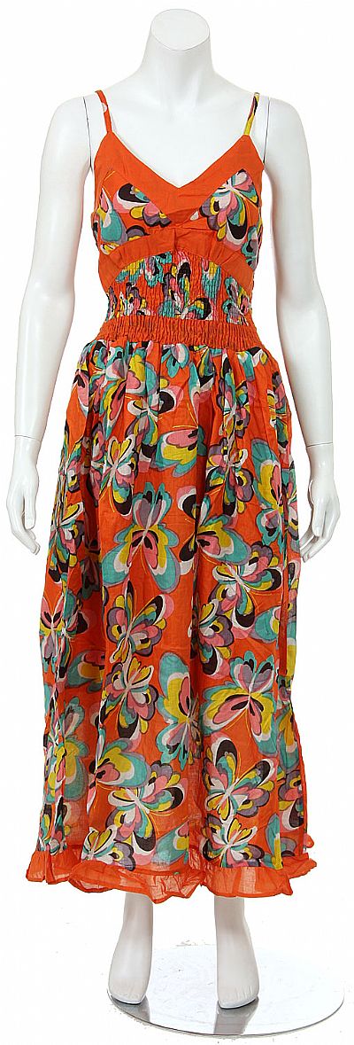 Spaghetti Strapped Butterfly Print Summer Dress in Orange. Made of 100% Cotton.
