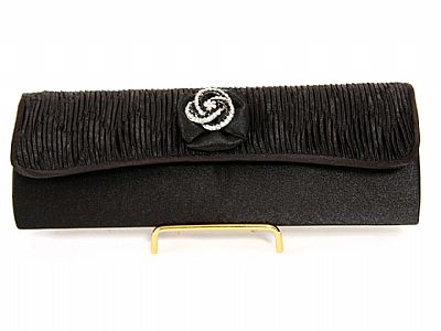 Satin clutch with rouching texture in top flap accentuated by an embelished single satin rose with rhinestones rings; in black. Measures: 10 x 3.5 x 2.5 inches