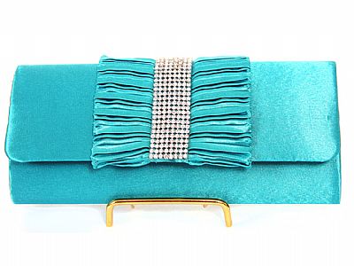 Elegant clutch with a ruffled bow detail and accentuating rhinestones at center of bow; in teal green. Measures: 9 x 4 x 2 inches