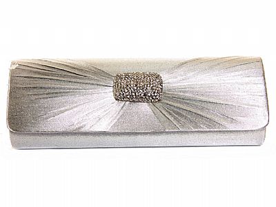 Satin clutch with rectangular ornament embellished with rhinestones and extending pleating on both sides of ornament; in silver. Measures: 10.25 x 3.5 x 2.5 inches
