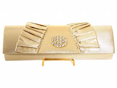 Elegant clutch with accentuating oval of rhinestones in different sizes. Pleating details on opposite sides of ornament; in gold. Measures: 11 x 3.5 x 2.5 inches