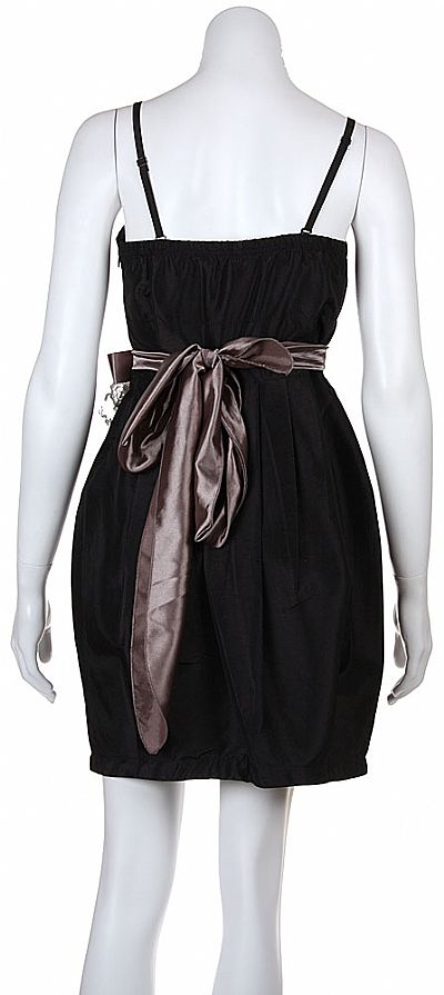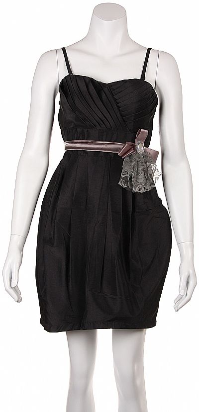 Short bubble party dress with a shirred bodice and pleated shirt. Dress has a removable ornamental bow that is tied at the back. Dress comes with removable straps; turns dress into a strapless gown. Elastic closed back.