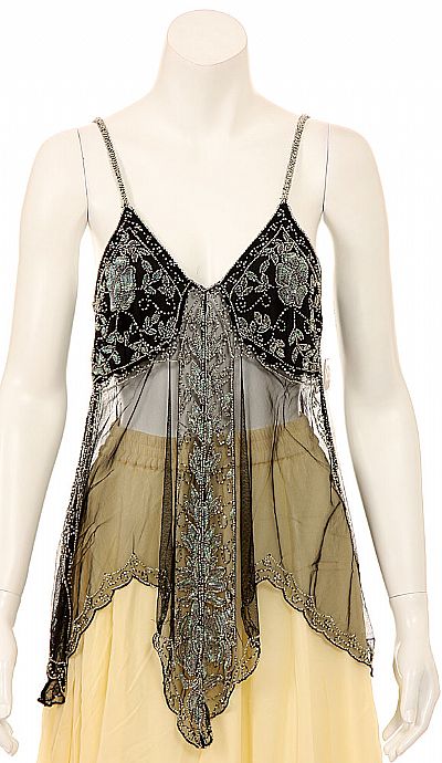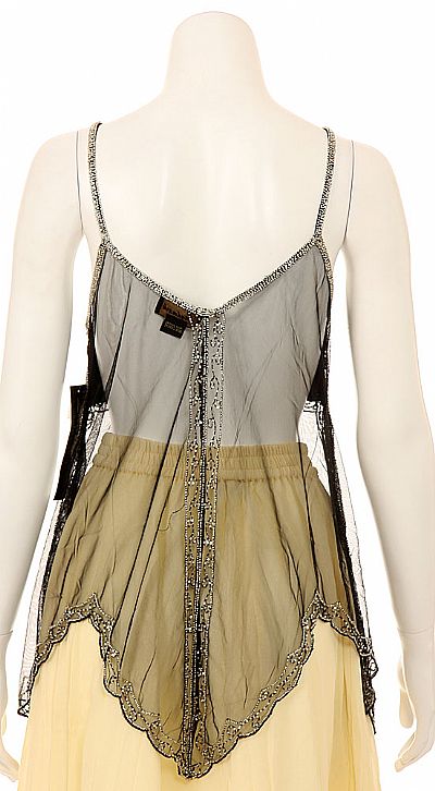 Spaghetti strapped top embellished with beads. Very sheer with a sequined covered bodice and outline. Beautifully designed with a hint of color beads. Made of 100% Nylon. Imported.