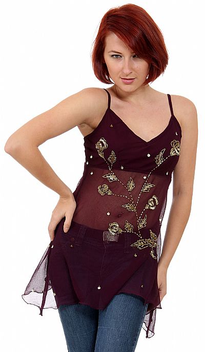 Vneck top with spaghetti straps and embellished with hand beaded and sequined details. Bust part is lined. Asymmetric hemline that goes below hips. Pull over top. 100% Polyester chiffon. Imported.