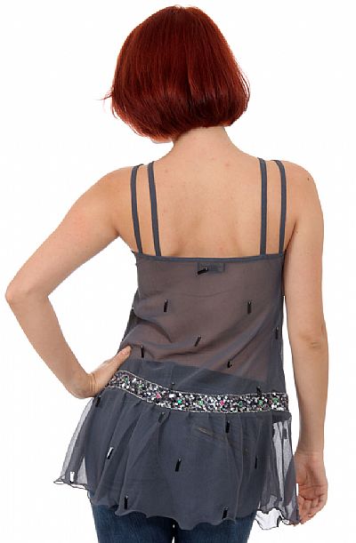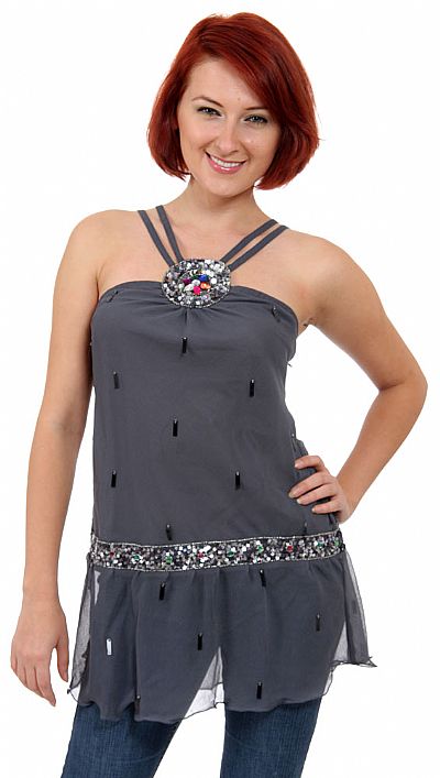 Double spaghetti strapped sheer sequined top. Nicely assembled with a fully sequined belt-like strap along the hip and a round brooch-like ornament right above the bust. Made of 100% Silk Chiffon. Imported.