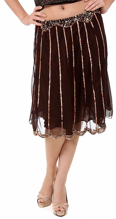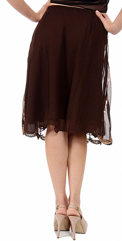 Knee length skirt with embelished sequin and beads details. Asymmetric hemline. Side zipper closure. 100% Polyester Chiffon. Imported.