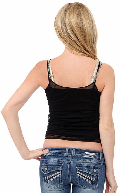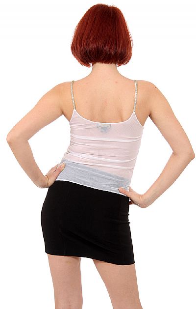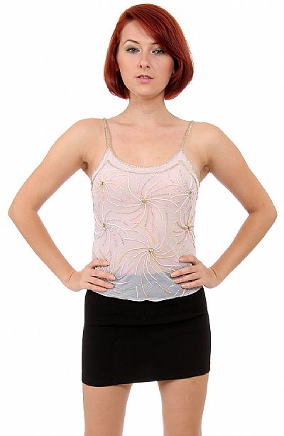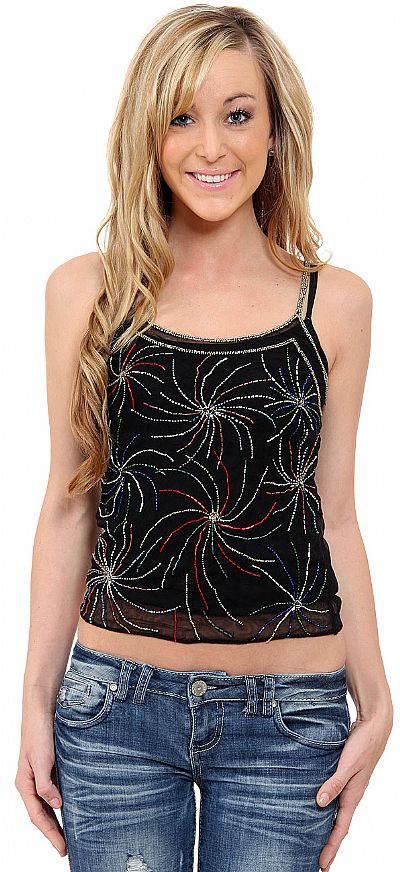 Beaded spaghetti strapped top of English net. Multicolor pipe beadwork follows a firework-like pattern.