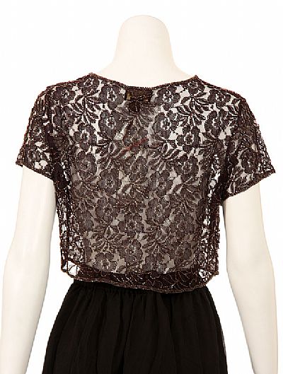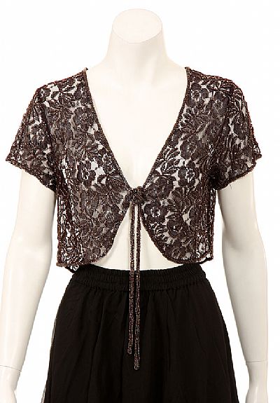Hand beaded jacket with netting fabric and floral design. Jacket has a tie knot closure. Wear it over your favorite dress or casual top.