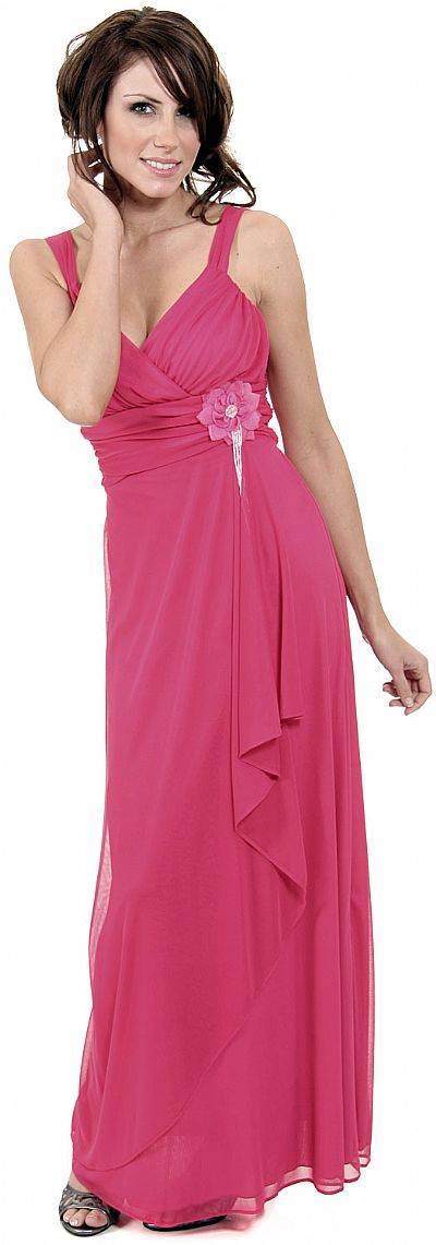 Wrap around bridesmaid dress with a shirred bodice and broad straps. Dress comes with detachable ornamental flower.